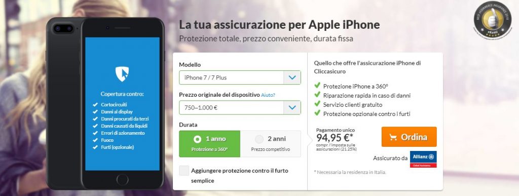 Come funziona Cliccasicuro? Acquistare una copertura assicurativa su questa piattaforma è estremamente facile grazie ad una grafica intuitiva e semplice. Ti basta scegliere la categoria del prodotto che vuoi assicurare tra quelli offerti, ad esempio televisori, cellulari o tablet e tanto altro, e selezionare la durata che desideri la tua assicurazione abbia. In seguito ti basta specificare il prezzo di acquisto dell’articolo che vuoi assicurare e cliccare su termina acquisto. Dopo di ché dovrai inserire le tue informazioni nel modulo che visualizzerai e completare il tutto scegliendo il tuo metodo di pagamento. Nella pagina stessa della polizza trovi maggiori informazioni sui servizi a tua disposizione come assistenza entro 24 ore o polizza contro furti, etc.
