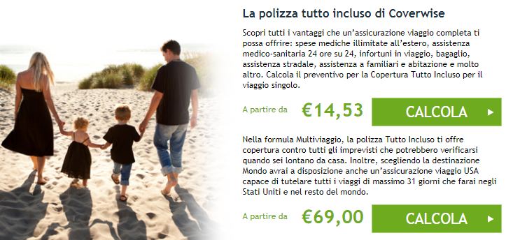 Veniamo al succo del discorso: come stipulare un’assicurazione viaggio e quanto verrebbe a costare? Coverwise ti offre diverse opzioni a seconda delle tue esigenze: puoi scegliere tra una polizza tutto incluso, copertura medica e bagaglio, e annullamento. Ognuna di queste scelte differisce l’una dall’altra per la presenza o meno di servizi in particolare. Ovviamente la polizza tutto incluso è quello più completa ma anche quella più costosa. Di che prezzi parliamo? Facciamo un esempio: un’assicurazione viaggio all inclusive per una giovane coppia in Europa per una settimana costerebbe 126€. Invece il viaggio di 10 giorni di una famiglia (2 adulti + 1 bambino) in tutto il mondo, compresi Stati Uniti e Canada, costerebbe 101€.