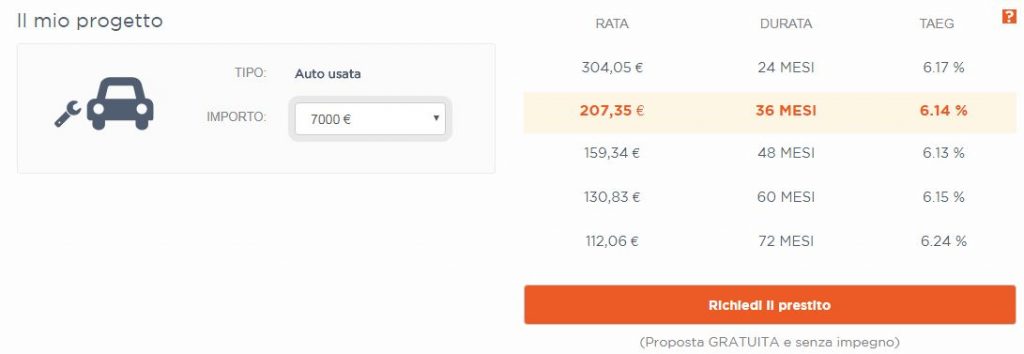 Più o meno lo stesso processo devi ripetere su Younited Credit per ottenere facilmente un preventivo. Di che tassi di interesse parliamo? Un prestito per un’auto usata da 7.000€ da estinguere in 36 mesi avrebbe TAEG 6,14% e TAN 4,22% per cui la tua rata mensile sarebbe 207,35€. Ovviamente le rate variano a seconda del tuo lavoro, dell’importo del tuo stipendio e dal tuo passato come creditore.
